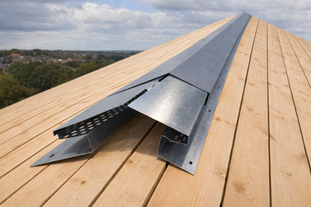 Le support et son capot de faîtage articulé ventilé sont des accessoires essentiels pour les couvertures en joint debout, ils servent de support de fixation au faîtage. Le support est pré-percé pour être fixé sur la volige le capot est fixé par vis de couture ou par rivet étanche sur le support.